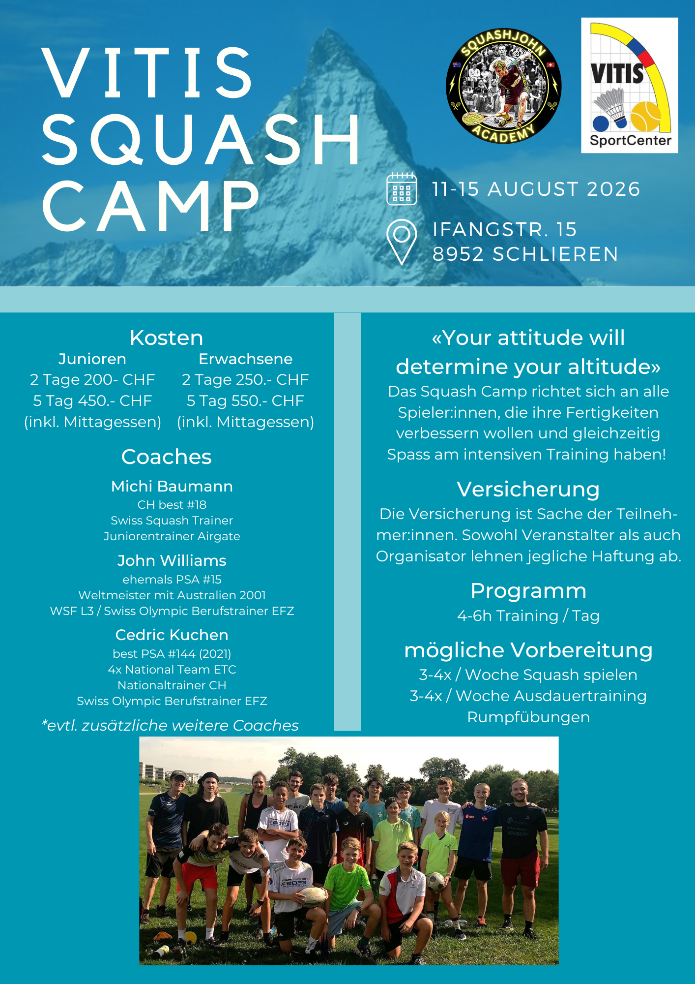 Le tout encadré par Johnny Williams (entraîneur chez Vitis Squash, ancien n°15 PSA, entraîneur WSF niveau 3 et entraîneur professionnel Swiss Olympic) / Cedric Kuchen (ancien n°3 suisse, entraîneur WSF niveau 3 et entraîneur professionnel Swiss Olympic) / Michael Baumann (entraîneur chez Airgate Squash, joueur de LNA, ancien n°18 suisse et entraîneur diplômé Swiss Squash)