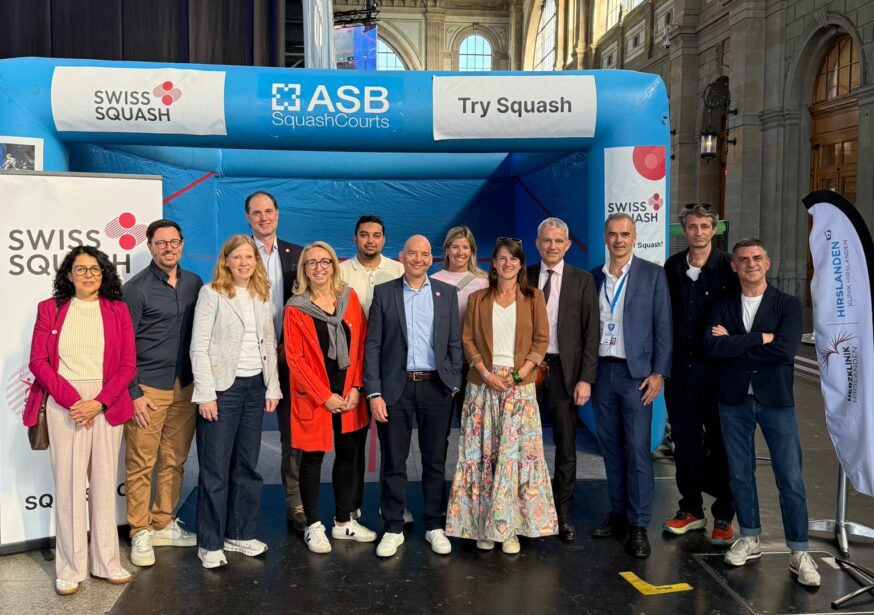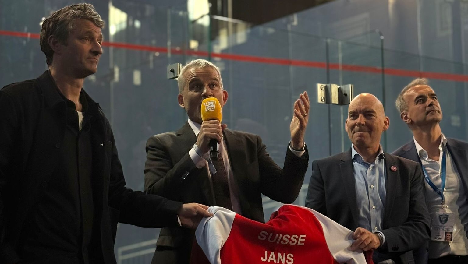 Im Rahmen des Abends überreichte Swiss Squash Bundesrat Beat Jans eine personalisierte Swiss-Squash-Jacke mit seinem Namen.